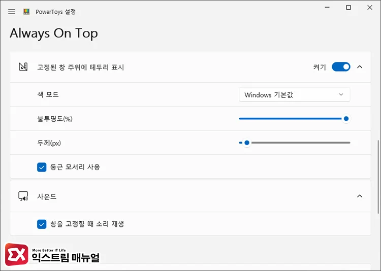 파워토이의 대시보드에서 Always On Top을 클릭하면 세부 옵션을 조정할 수 있습니다. 파란색 테두리를 없애려면 “고정된 창 주위에 테두리 표시”를 끔으로 변경하거나 두께를 최소로 줄여 사용하면 되겠습니다.