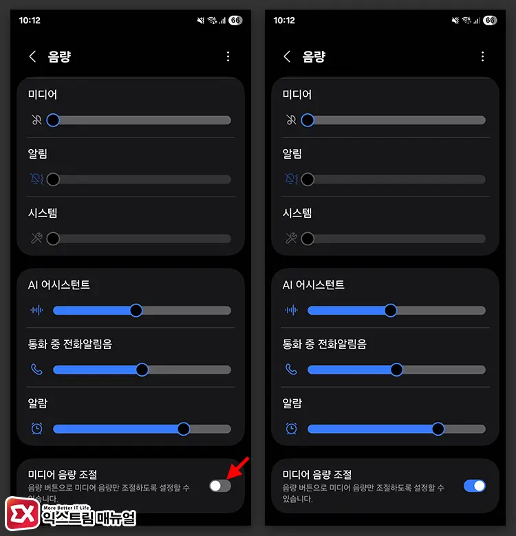- 음량 설정 가장 하단에 있는 “미디어 음량 조절” 옵션을 [켬]으로 변경합니다.